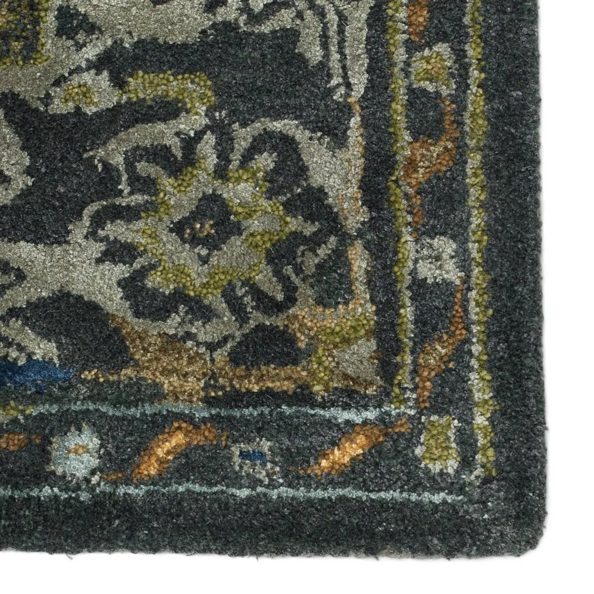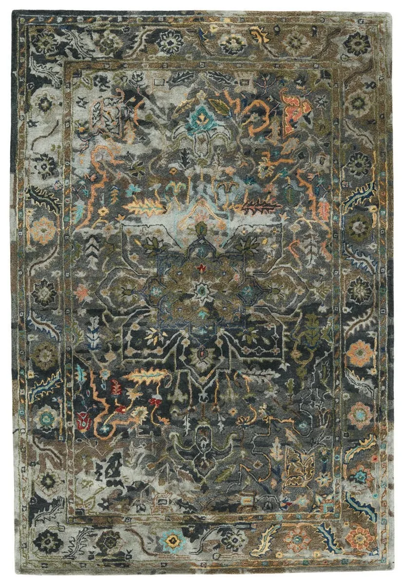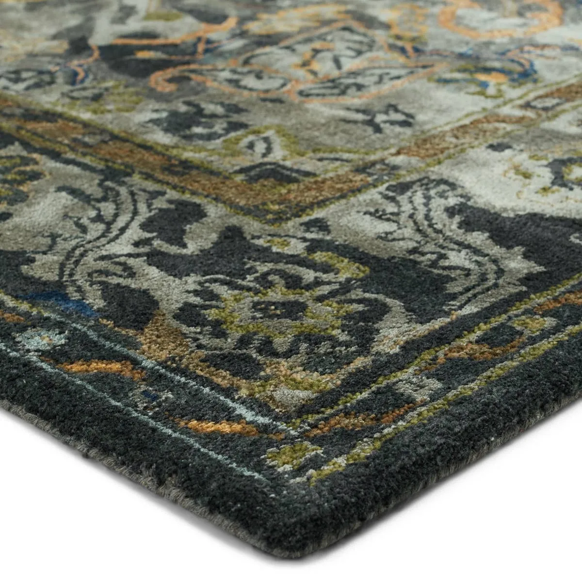 The Citrine collection is an assortment of distressed Old World patterns reinterpreted for modern design. The hand-tufted Cristobol rug showcases a center starburst medallion, accented by striking and moody hues of gray, dark green, gold, silver, and turquoise. Made of viscose and wool, this timeless rug boasts an ultra-soft feel and elegant, subtle sheen.