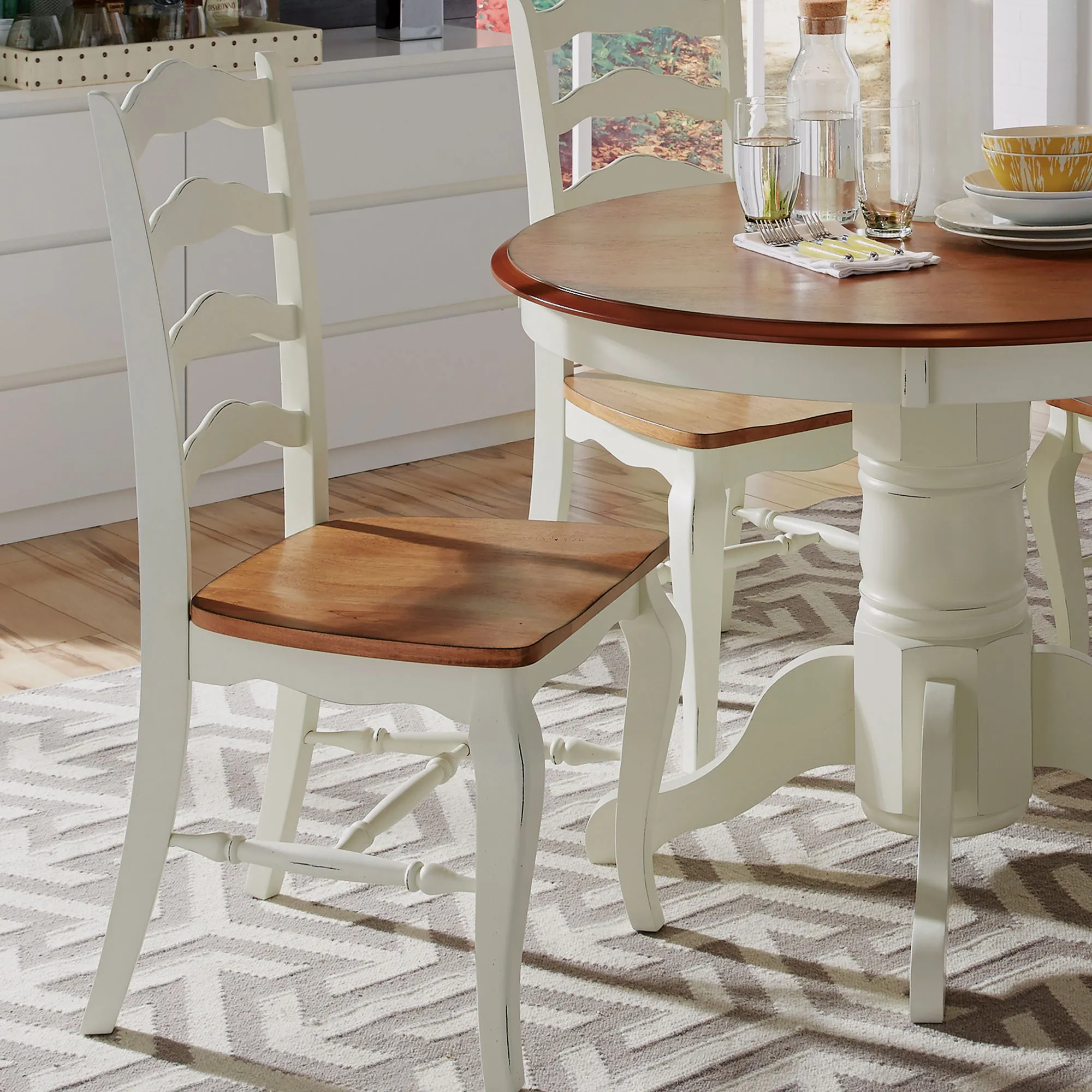 Enjoy a little flavor of mainland Europe with this Homestyles French Countryside 5-Piece Dining Set. The different finishes on the table top and seats provide a stylish contrast, while also feeling right at home in any dining room. The combination of hardwood and engineered wood creates a centerpiece of your kitchen that will look great for years.