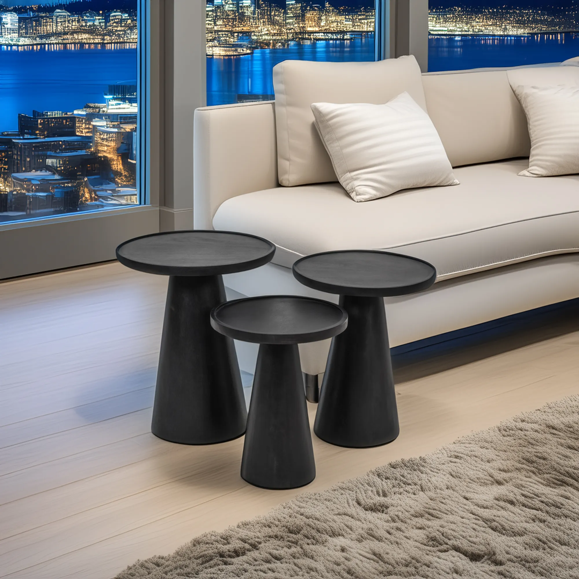 - -Set of Three Accent End Tables -Solid Mango Wood -Easy No-Tool Assembly -Tapered Mid-Century Modern Style -Large Table: 18" Diameter -Medium Table: 16" Diameter -Small Table: 14" Diameter