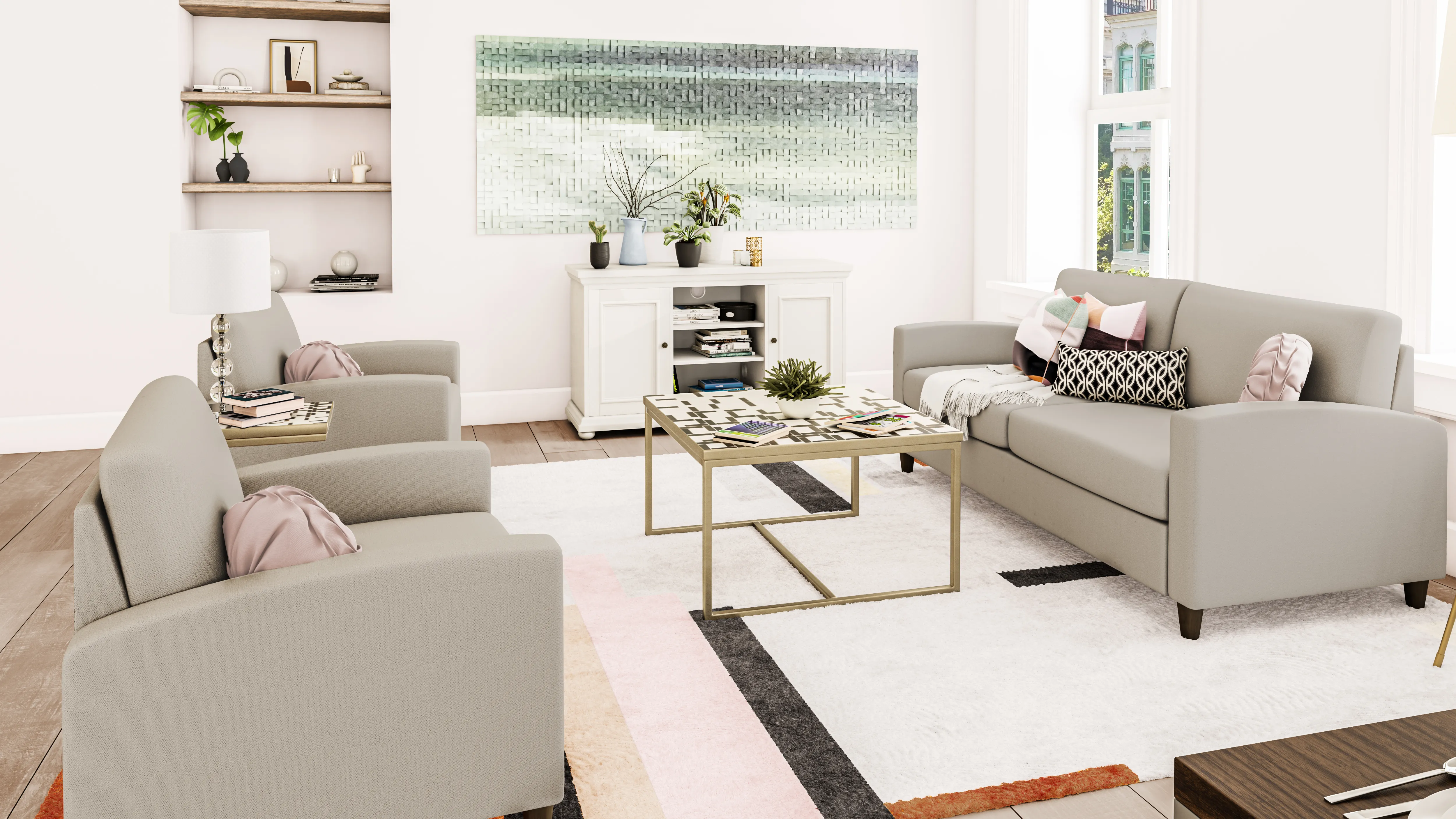 Whether used on its own or as part of a larger seating arrangement, you're adding comfort and style with this Homestyles Blake Sofa. Perfect for any space from a small apartment to a great room, it delivers clean lines, contoured slope arms, and a neutral sandshell colored fabric. Supportive, pillow-back cushions provide superior comfort, and the hardwood frame creates a solid foundation.